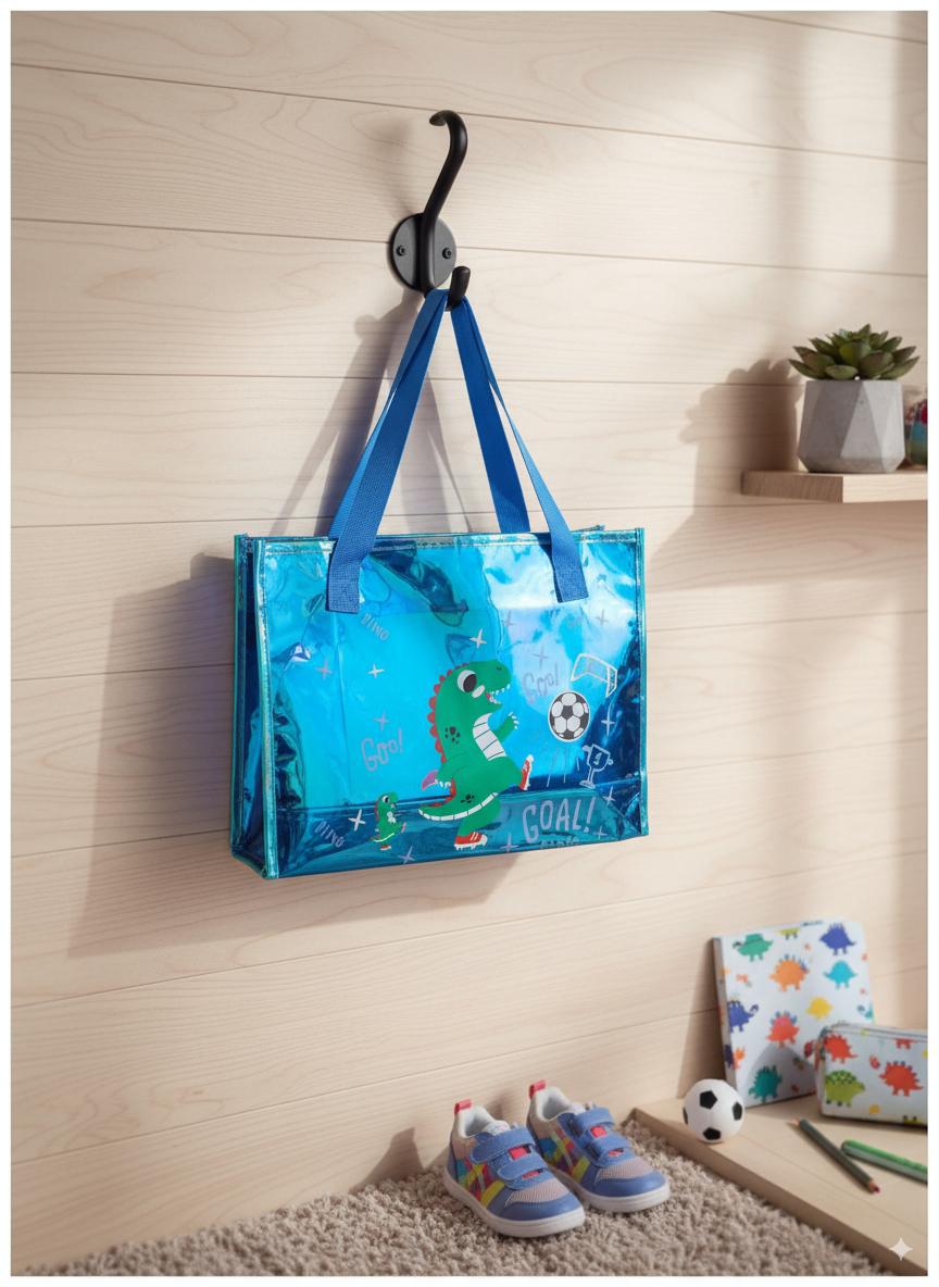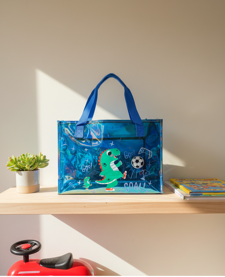 Unleash ultimate cuteness with our blue holographic dino bag! 🌈🦖 This see-through tote features a playful dinosaur kicking a soccer... Read more