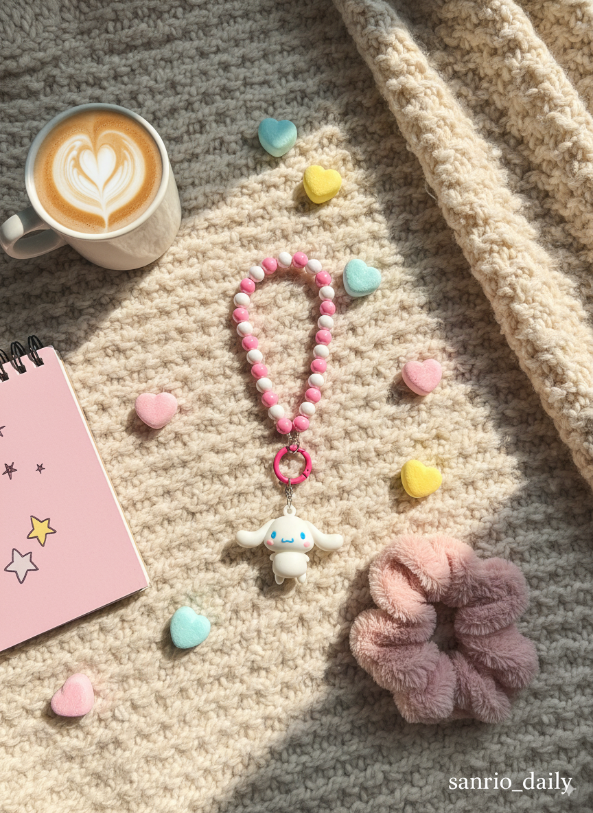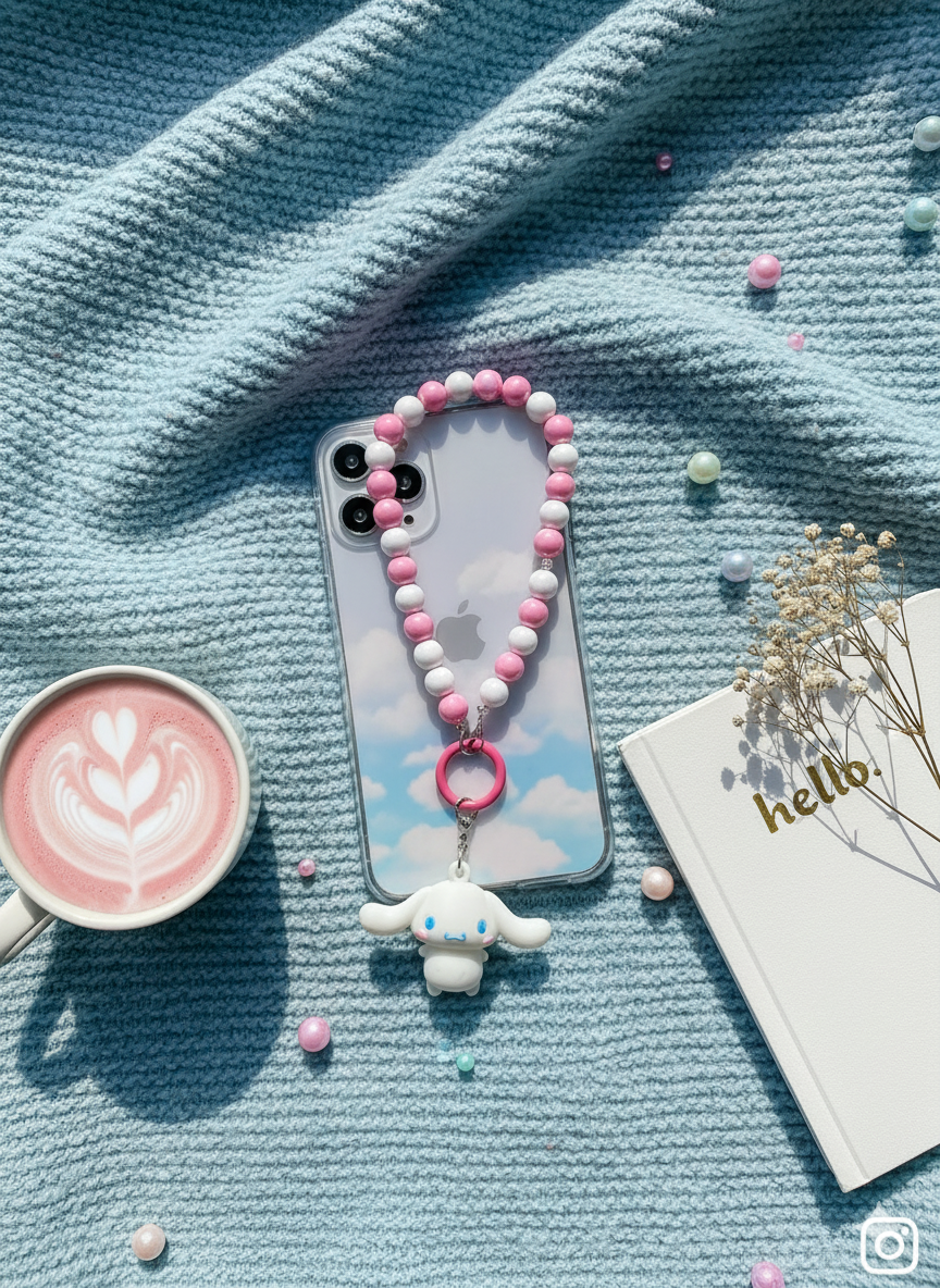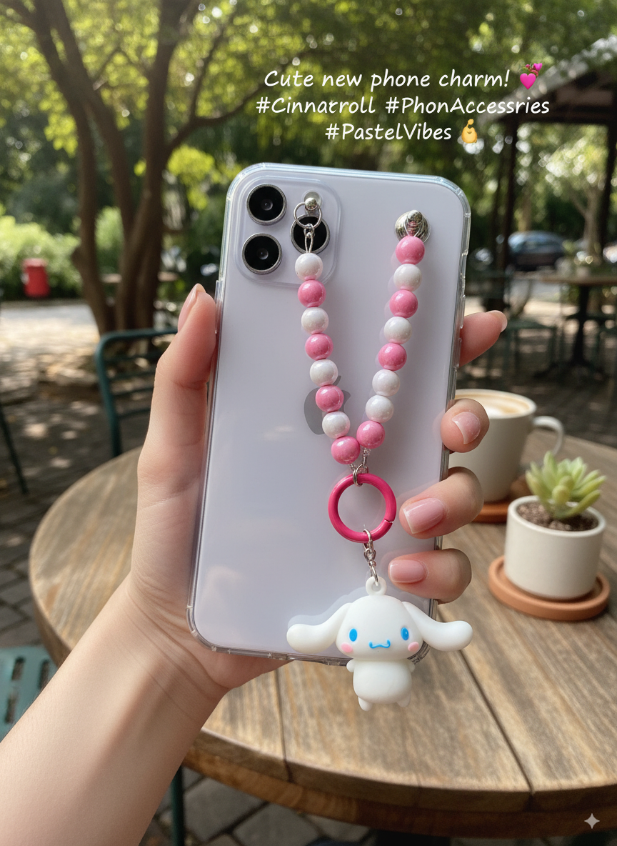 Cinnamoroll Phone Charms with Pink Beaded Strap – Cute Sanrio Bag Charm Accessory