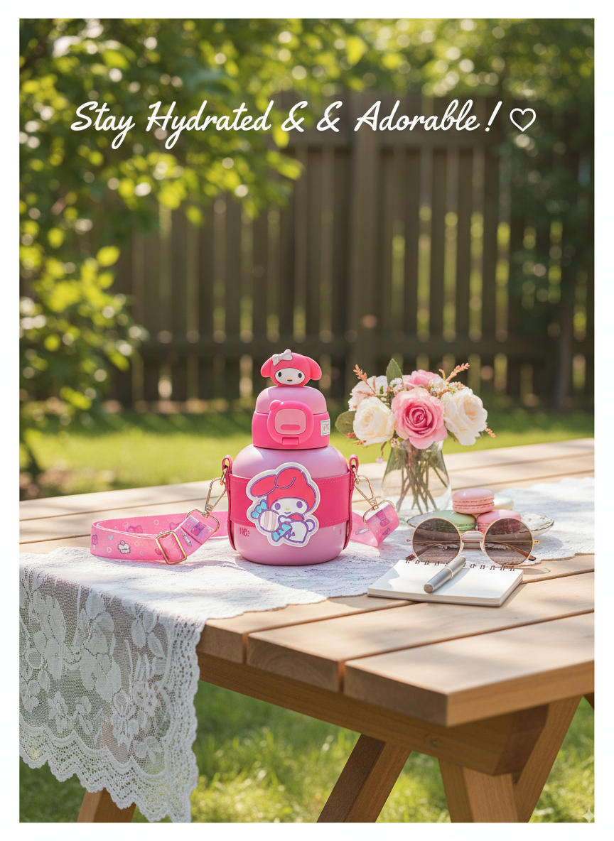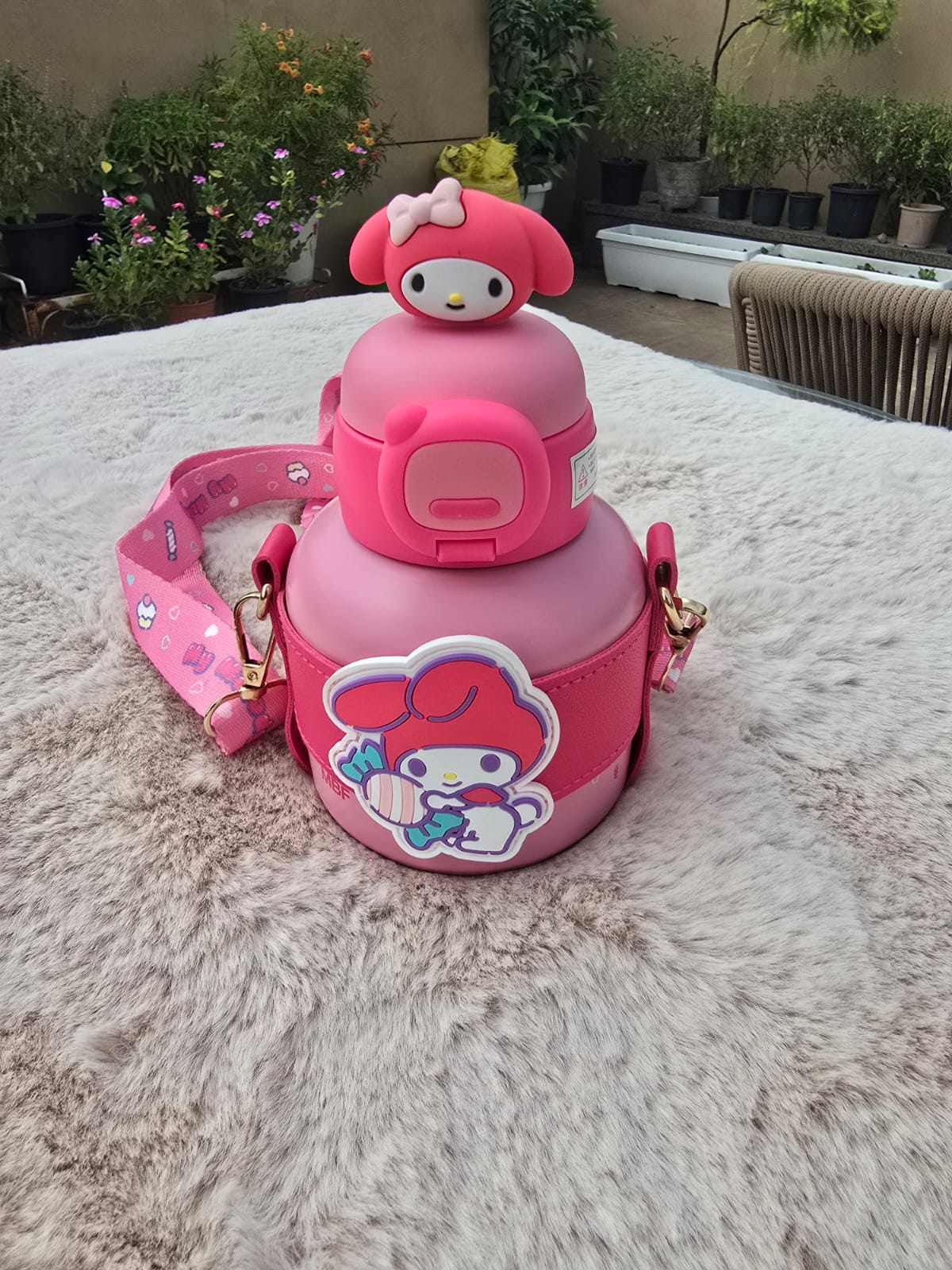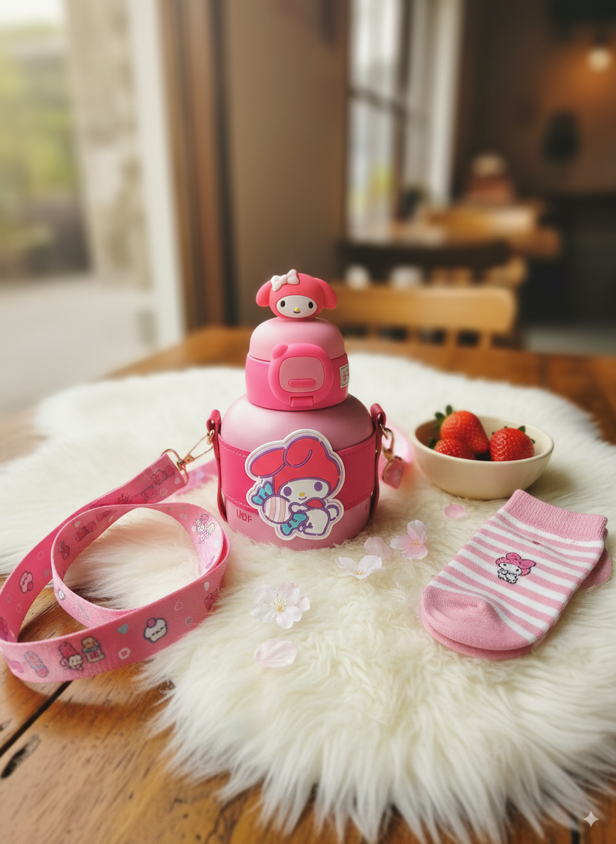 My Melody Water Bottle with Strap โ Sanrio Pink Kawaii Drink Bottle with Cover & Handle